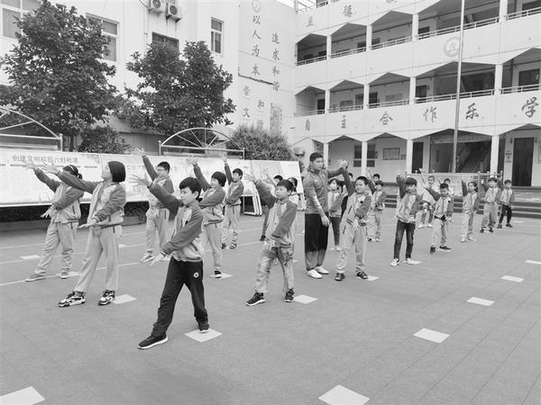 为积极推广中华传统体育项目,以体育人、以文化人,引导师生传承和发扬中华优秀传统文化,近年来,周口市回民小学创新教育理念,聘请国家级非物质文化遗产传承人、中国武术八段获得者买西山为武术顾问和总教练,将我市国家级非物质文化遗产心意六合拳列入学校课程,创编心意六合拳健身操(英雄少年),并且融入阳光大课间活动,强健了学生体魄,磨炼了意志,有力提升了学生健康水平和校园文化品位。图为学校体育教师郑文龙教授学生习练心意六合拳。