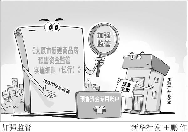 记者从山西省太原市政府了解到,太原市将于12月30日起实施《太原市新建商品房预售资金监管实施细则(试行)》。按照规定,购房人支付的首付款、贷款等资金将直接存入专用账户,有关部门对资金支取实施监管。房地产开发企业违反该实施细则,将被采取暂停使用预售资金、停止商品房项目销售等措施。