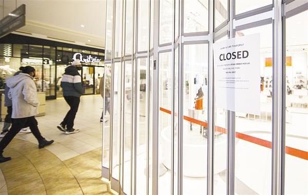① 12月1日,在加拿大安大略省布兰普顿,人们走过一家暂停营业的商店。新华社发