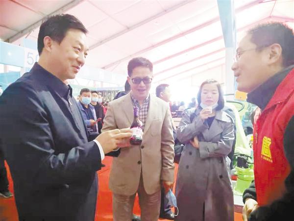 11月27至29日,首届周商大会成功举办,位于周口市体育中心广场的周商产品展示展览活动如期启动。在西华展区,无人机、胡辣汤、桑葚系列酒、黑小麦系列产品等一经亮相,便引来众人参观。图为活动期间,西华县委书记林鸿嘉到展区检查指导。记者 张猛 摄