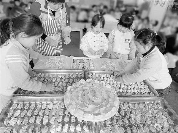 12月21日是冬至。为让孩子们了解中国传统节日的民俗文化,继承传统习俗,体验生活,周口市市直幼儿园为大班的小朋友开设了生活课程——包饺子。图为孩子们在学包饺子。