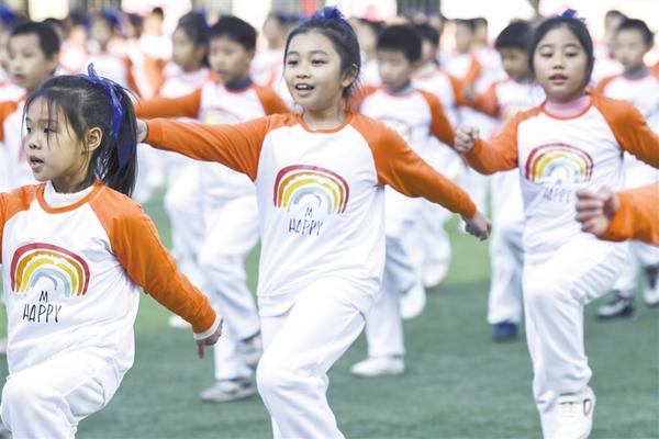 12月21日,南宁市滨湖路小学学生表演团体操。当日,广西南宁市滨湖路小学2020年秋季学期体育文化节开幕,多个年级的学生展示了精心准备的团体操。在为期一周的体育文化节里,学校还将举办亲子趣味竞技赛、旱地龙舟、抛绣球等活动。新华社记者 曹祎铭 摄