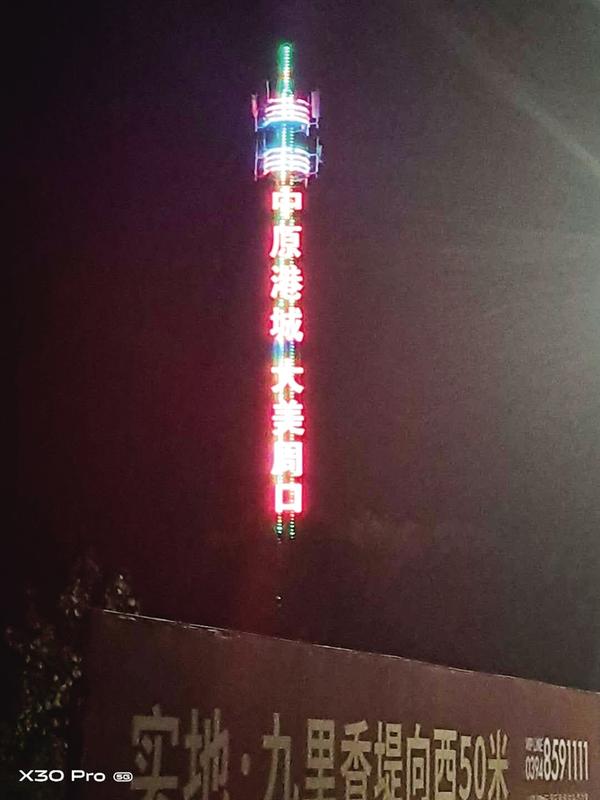 夜幕降临,在城乡一体化示范区,市民抬头就会发现在高铁周口东站和周口大道北段,几座铁塔闪烁着“中原港城 大美周口”字样,在夜色里蔚为壮观。这是中国铁塔股份有限公司周口市分公司铁塔亮化工程是一种尝试,对铁塔进行亮化改造,实现一塔多用,资源共享,让铁塔景观成为城市文化的传播载体,既提升了周口的城市形象,也丰富了相关主题教育、公益、旅游等宣传渠道,达到社会宣传效果。