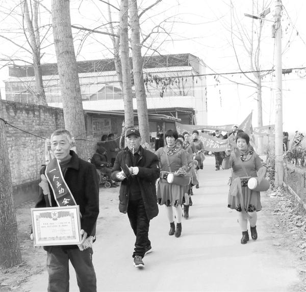 12月28日,太康县符草楼镇符西行政村锣鼓喧天、喜气洋洋。太康县军地领导敲锣打鼓把三等功喜报和慰问金送到现役军人许庆副家人手中。图为送喜报现场。记者 马治卫 通讯员 周存亮 摄