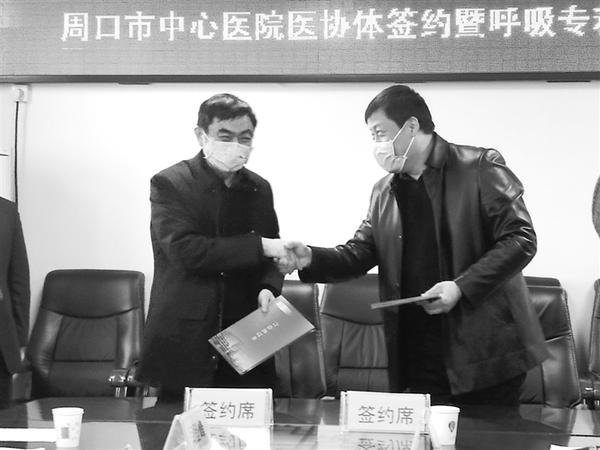 1月8日下午,周口市中心医院与周口骨科医院等医疗机构签订医疗协作体协议,以达到资源共享、优势互补,在全市构建一体化医疗服务救治网络,更好落实分级诊疗,更好服务周口患者的目的。图为签约现场。记者 孙靖 摄