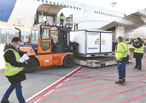 1月16日,在塞尔维亚首都贝尔格莱德,机场工作人员卸载首批100万剂由中国国药集团生产的新冠疫苗。