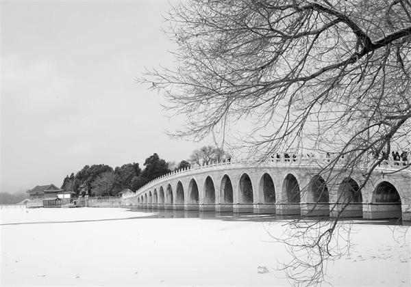 1月19日拍摄的颐和园十七孔桥。当日,北京迎来降雪天气。