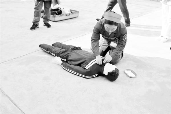 右图为该院急诊科护士长张丹凤现场演示并讲解心肺复苏的步骤和正确方法。