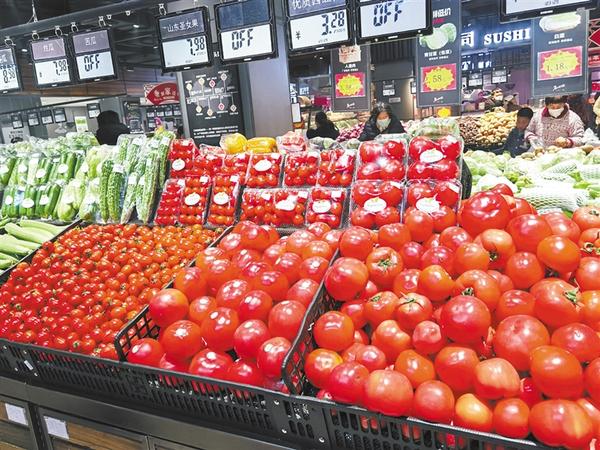 顶花带刺的黄瓜、汁水丰盈的西红柿……春节临近,我市市场上蔬菜供应充足,品种繁多,一些蔬菜价格略微上涨。图为市民在超市购买摆放整齐有序的新鲜蔬菜。 记者 李凤霞 摄