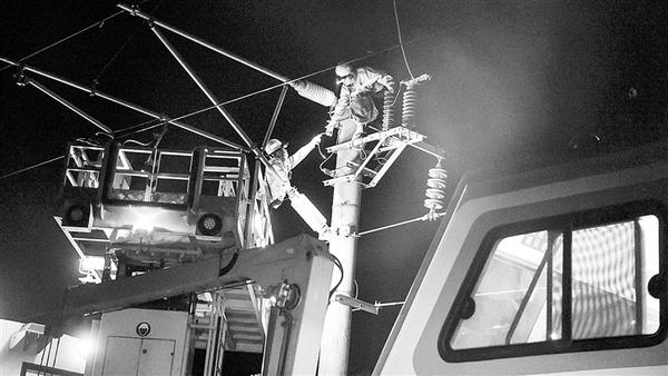 1月25日凌晨,作业负责人宁耀剑(左)向接触网支柱上操作的蒋鹏传递材料。连日来,中国铁路南宁局集