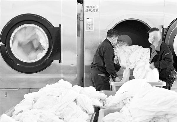 1月27日, 在福州客运段卧具洗涤厂,工作人员把卧具放入自动洗涤机,进行浸泡、消毒和洗涤。春运即将到来,南铁福州客运段针对列车上旅客贴身的被套、枕套、台布等卧具洗消进行特别调整,增加了高温消杀等流程。