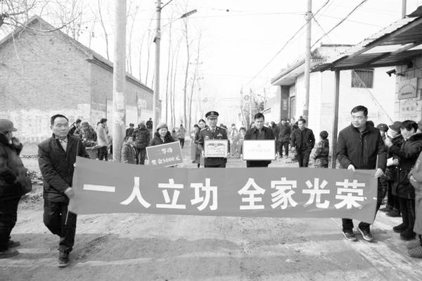 1月26日,商水县人民武装部和商水县退役军人事务局工作人员组成的联合派送喜报小组来到二等功臣高永红家中,为其家属送去了贺礼。当天,荣立二等功的王俊涛、刘国席家里也收到了同样的贺礼。