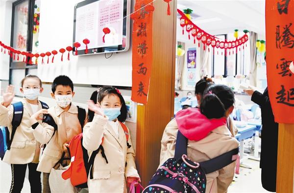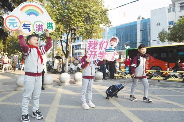 ① 2月22日,在安徽省合肥市和平小学,孩子们举着多彩的展板欢迎同学返校。当日,安徽省合肥市中小学迎来开学,不少学校组织了形式多样的活动欢迎同学们返校。