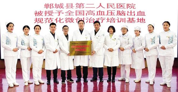 春节前夕,由中国研究型医院学会脑血管病学专业委员会举办的第九届脑血管病长城论坛·脑出血微创治疗培训班在山东临沂举行。郸城县中心医院(二院)脑外胸外科首席专家张其云率队参加,中心医院神经外科被授予为“高血压性脑出血规范化微创治疗培训基地”(如图)。