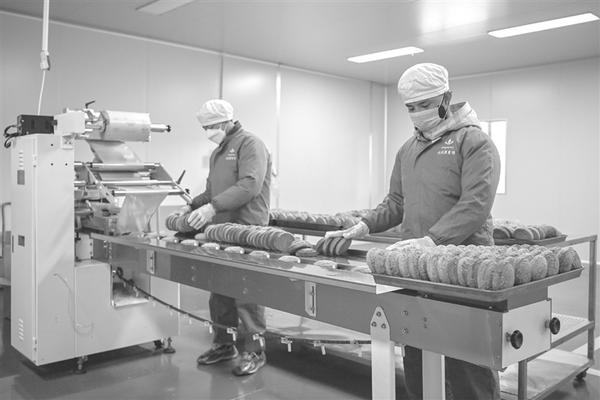 2月25日,在四川省阿坝县托岗黑青稞生产车间内,工作人员对烘焙后的黑青稞饼进行包装。