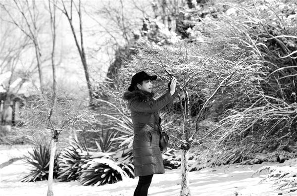 3月1日,市民在天津市南翠屏公园内拍摄雪景。