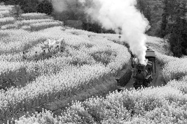 3月2日,一列嘉阳小火车经过段家湾蜜蜂岩的油菜花海。