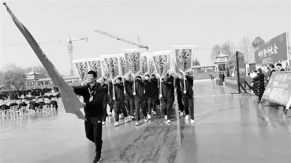 3月14日上午,周口新星学校操场上彩旗飘扬、歌声激昂,该校九年级中考百日冲刺誓师大会在这里举行。记者 陈军强 摄
