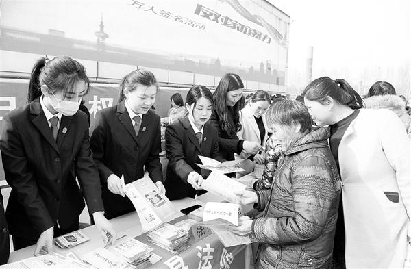 近日,太康县人民法院组织女法官们在县人民广场集中开展以“维护妇女权益 反对家庭暴力”为主题的普法宣传活动。