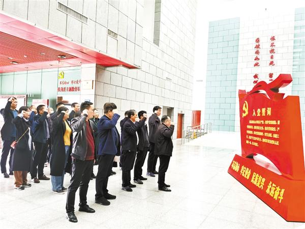 3月20日,市委政法委组织机关全体党员干部到扶沟县吉鸿昌将军纪念馆开展“主题党日”活动,接受革命传统教育,感悟共产党人的初心和使命。图为在吉鸿昌将军雕塑前,面对鲜红的党旗,市委政法委机关全体党员整齐列队,庄重地举起右手,重温入党誓词。