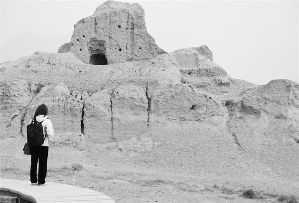 一名游客观赏苏巴什佛寺遗址(3月22日摄)。