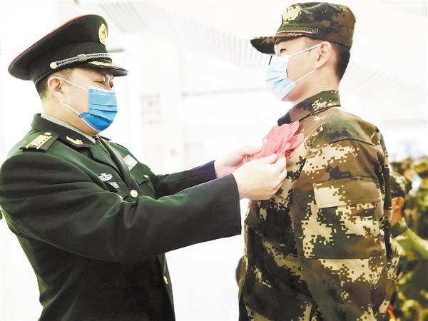 ②周口军分区副司令员薛振喜为新兵佩戴大红花。