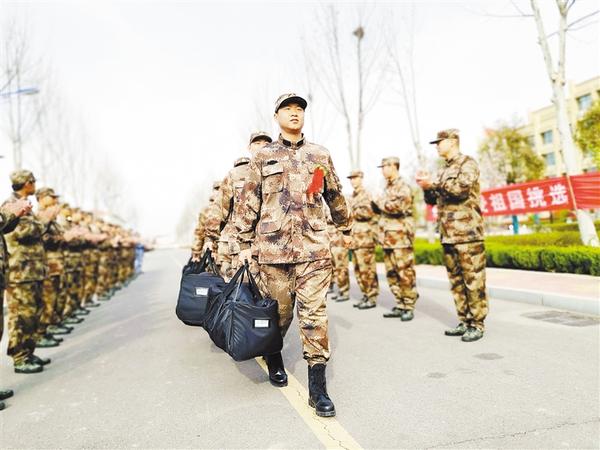 ③新兵们迈着坚定的步伐走向军营。