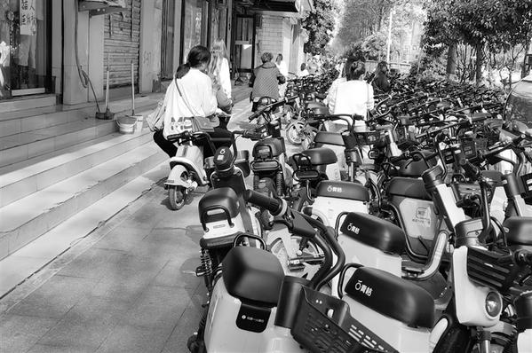 3月28日下午,记者看到,在七一路老市委门口至五一路口的人行道上,停满了橙色、绿色的共享电动车,严重阻碍了行人通行。