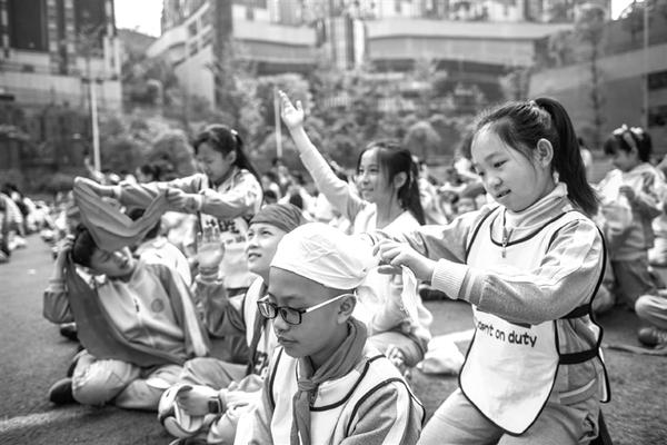 3月29日,芳草地国际学校贵阳分校的学生在学习三角巾包扎法。当日是全国中小学生安全教育日,芳草地国际学校贵阳分校开展安全教育及社会实践活动,普及应急救护知识,增强学生们的安全意识。新华社发