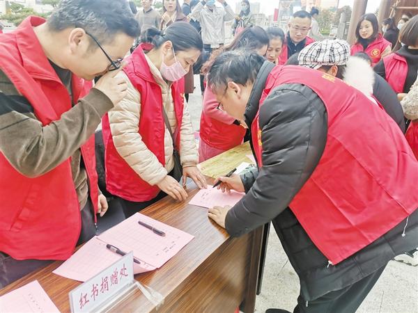 为深入开展党史学习教育,增强广大干群的认同感、荣誉感、责任感,助力我市创建全国文明城市,3月23日,由周口市城市管理局、川汇区委联合组织开展的“学党史、捐红书、聚红心、创文明”活动在五一文化广场市民驿站举行。图为志愿者捐赠红书。记者 韩志刚 通讯员 理效明 摄