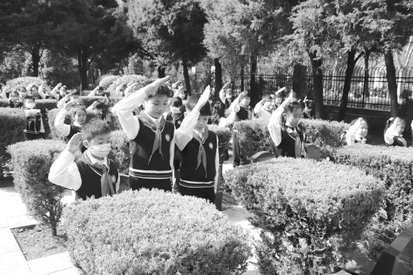 在清明节来临之际,我市各中小学组织学生到烈士陵园开展扫墓活动,缅怀先烈,致敬英雄。图为周口市文昌小学学生行少先队礼祭奠英烈。