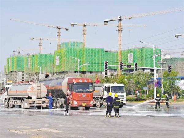 为尽快消除险情,现场指挥部决定调来3辆油罐车将发生事故油罐车内的汽油抽出转运到安全区域(如图)。与此同时,消防人员不断对罐体进行物理降温;应急管理部门又调来储备的沙土等工具对现场的下水系统进行封堵,阻止汽油流向下水系统;环保部门进行空气监测;污水处理厂进行雨、污水管网内油水指标检测。在各部门通力配合下,当日11时10分许,油罐车内存储的汽油被全部抽取运离现场,解除了险情,现场交由开发区公用事业管理中心进行清理扫尾。