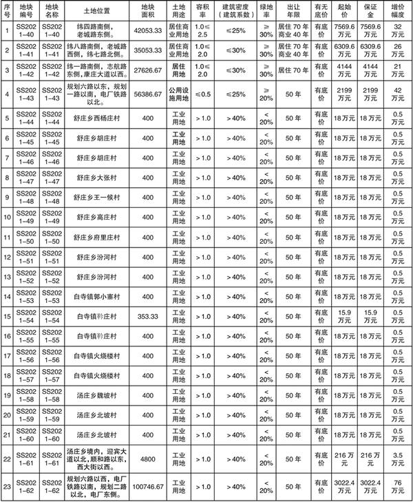 备注:(1) SS2021-40号土地商业建筑面积不大于地块地上总建筑面积的10%,地上附属物由国资局负责处理。(2)SS2021-41号土地商业建筑面积不大于地块地上总建筑面积的10%。(3) SS2021-44号至SS2021-61号用于风力发电项目,统一规划建设,竞买人须同时报价竞买。