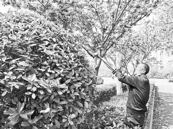春季绿植养护正当时,4月8日上午,周口市城乡一体化示范区的园艺工人正在修剪周口大道边的绿植。 记者 孙安平 摄