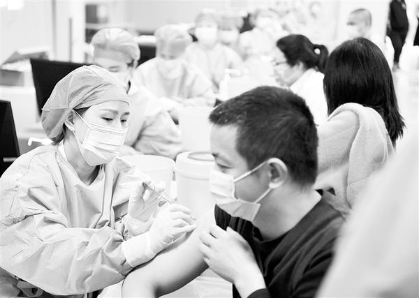 4月8日,在重庆江北观音桥商圈的“方舱接种点”,医护人员为市民接种新冠疫苗。当日,位于重庆市江北区观音桥商圈的新冠疫苗方舱接种点正式启用,给市民接种新冠疫苗带来便利。新华社发