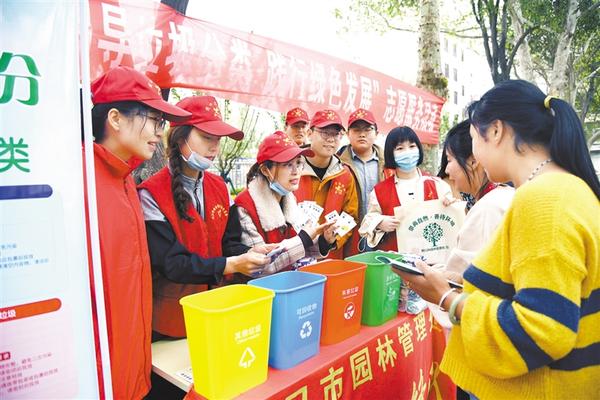 4月13日,在周口市中心城区五一文化广场,志愿者向过往群众发放垃圾分类宣传卡。据悉,市政管理部门在这里设立垃圾分类投放试点,积极推进生活垃圾分类,让垃圾分类成为一种习惯,让文明投放垃圾成为一种素养。记者 王映 摄