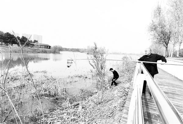 4月16日,周口植物园工作人员及保洁人员打捞漂浮在湖水中的垃圾及枯草。据悉,为给市民提供一个干净、优美的人居环境,植物园工作人员每天都会清理湖面垃圾。他们希望广大市民游玩锻炼的时候,珍惜保洁人员的劳动成果,不要随手把饮料瓶、塑料袋等垃圾扔进湖里。记者 孙安平 摄
