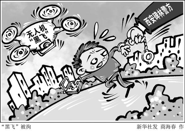 4月17日西安马拉松赛进行期间,有人未经申请和报备,擅自操控无人机在永宁门附近“黑飞”,被执勤民警抓获,并被处以行政拘留5日处罚。据警方介绍,这是陕西省第一起因无人机“黑飞”扰乱公共秩序被行政拘留的案件。新华社发 商海春 作