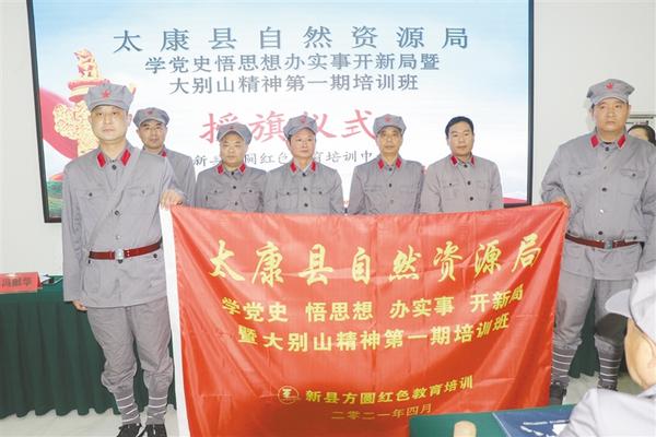 为把红色资源利用好、把红色传统发扬好、把红色基因传承好,4月8日,太康县自然资源局委托县委党校,组织部分党员干部奔赴新县革命老区,举办第一期党史学习教育专题培训班,弘扬大别山精神。图为学员们身着红军服留念。