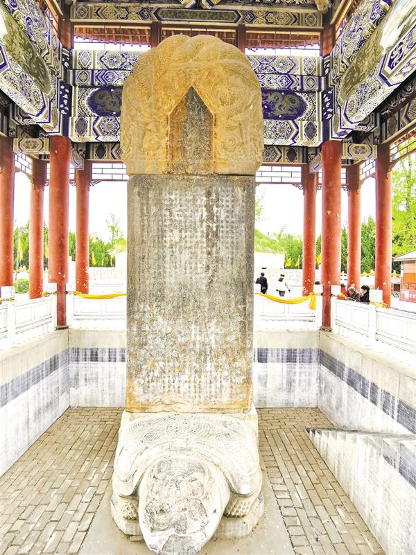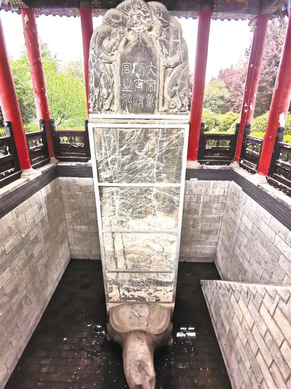 大宋重修太清宫之碑——这通碑立于北宋大中祥符七年,也就是公元1014年。由于年代久远和风雨的剥蚀,上面的碑文已经模糊,但碑首的雕刻工艺十分精细,达到了非常高的艺术水平。此碑用盘龙做碑首说明此碑刻是皇家御制。碑文记载了宋真宗赵恒朝拜并重修太清宫的经过,重点记述了修复后太清宫宏大的规模和壮观的气势。宋真宗重修后的太清宫,规模达到历史上的鼎盛,史书记载:“庙貌比唐时有加。”由于这块石碑一直在原址,所以它下面的地基就是宋朝鹿邑的地基。鹿邑属于黄泛区,黄河泛滥时都会造成地层淤积,汉朝的老子祠坍塌后就堆积在土层的最下面,唐朝的太清宫又在新的地层上重新建设,唐朝的基址被淤积后,宋朝又在它的上面新建了太清宫。