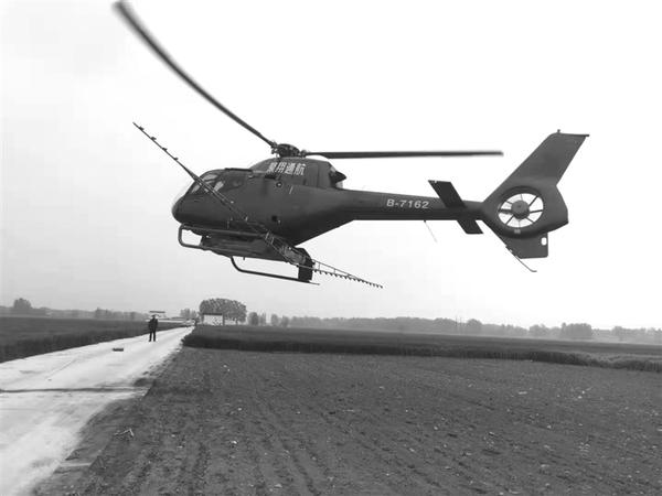 4月25日,郸城县秋渠乡组织直升机实施飞防作业,对全乡26个行政村的小麦喷洒防治赤霉病药物,受益面积达7万亩。据悉,近期连绵阴雨容易导致小麦赤霉病,该县高度重视小麦防虫防病工作,认真组织实施小麦赤霉病防治药物喷洒,确保小麦丰产。