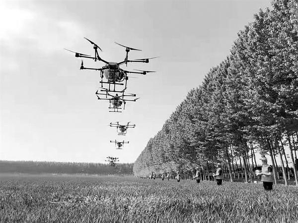 据了解,该镇还组织“两代表、一委员”齐上阵,划清责任区域,严把“两监督、一到位”,即监督飞防面积、监督足量用药,全面喷洒到位。在县群防群治每亩补贴10元的基础上,该镇主动承担飞防费用,聘请社会服务公司动用100多架无人机同时作业,对全镇7.8万亩小麦实施统防统治,实现全覆盖。③6