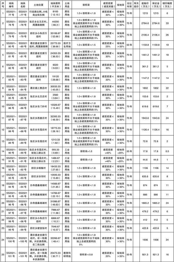 备注:SS2020-77号土地地上附属物补偿款2391.34万元由土地竞买人另行交纳。SS2020-78、SS2020-79SS2020-81、SS2020-82、SS2020-83、SS2020-86、SS2020-87、SS2020-88、SS2021-89、SS2020-100商业建筑面积不大于地块地上总建筑面积的5%。