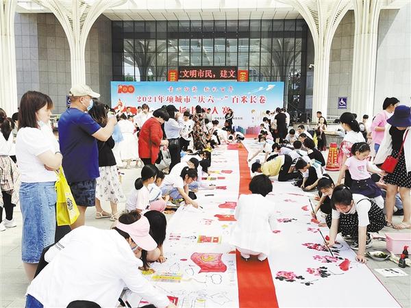5月29日,由项城市委宣传部、市行政服务中心和市文化广电和旅游局主办,市文化馆承办的“童心向党、献礼百年”2021年项城市庆“六一”百米长卷少儿现场书画大赛在市民之家举行,来自项城市的200余名小选手参加比赛,他们用手中的画笔表达了对党和祖国的热爱。 记者 杨光林 摄