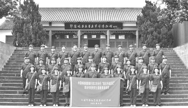 本报讯(记者 韩志刚 通讯员 郭哲一 文/图)为落实党史学习教育工作的实施方案,市分行党委于2021年6月8日至6月11日在信阳大别山组织举办以学习党的光荣历史,传承弘扬长征精神为目的的“我们不会忘记”革命传统教育主题实践活动培训班,各党支部书记、纪检委员、市分行各部门正副职等35名党员参加了此次培训班(如图)。