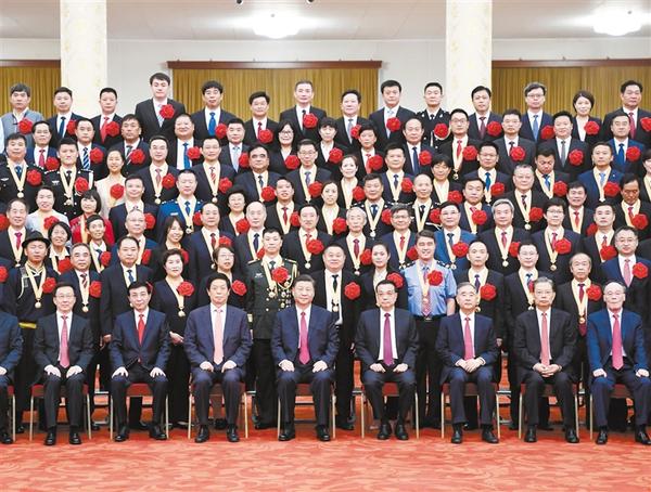 中共中央政治局常委李克强、栗战书、汪洋、赵乐际、韩正,国家副主席王岐山出席颁授仪式。中共中央政治局常委王沪宁主持。