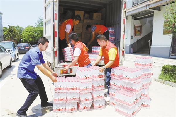 当天中午,挂着印有“昨天大家助我脱贫,今天我为救灾出力!”字样条幅的防汛救灾物资运输车抵达周口港区。“要不是前两天防御台风‘烟花’,我们早就来了。”隆古村党支部书记段长春一下车就连忙慰问众人。一同前往的还有6位年轻力壮的志愿者,他们不辞劳苦,和港区消防、城管人员一起顶着烈日,用了半个多小时将满车物资搬运到位(如图)。