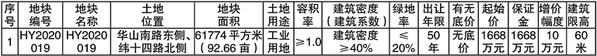 3.HY2020019宗地具体产业类型为专用设备制造业,投资强度≥3750万元/公顷;严格按照国家标准配套建设公共服务设施,行政办公及生活服务设施用地面积不得超过总用地面积的5%,严禁建设成套住宅、专家楼、宾馆、招待所、培训中心等非生产性配套设施。