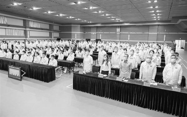 8月17日,第16届残奥会中国体育代表团成员在动员大会上唱国歌。