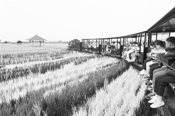 8月16日,游客乘坐小火车在稻田中观光游览。